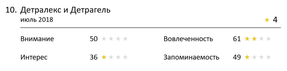 Больше половины роликов подборки не отличились особенно интересным сюжетом, и потому 5 из них получили всего 2 звезды, а реклама «Детралекс и Детрагель» никак не может подняться с нижних позиций рейтинга и зарабатывает всего одну звезду.