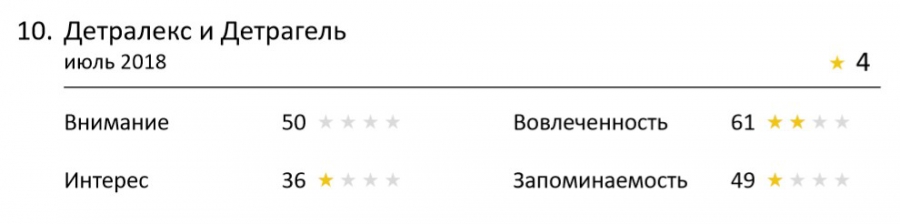 Реклама «Детралекс и Детрагель», оказавшаяся на грани между лучшими и худшими, удалось все-таки ухватить одну звезду и набрать 49 баллов, а вот остальные дотянуться до звезд не смогли. Целых 6 роликов попали на нижние ступени рейтинга, и хотя многие из них занимали высокие позиции в других категориях, по показателю «Запоминаемость» они не получили ни одной звезды.