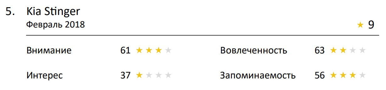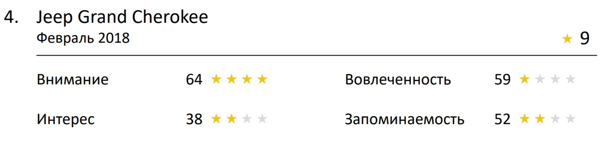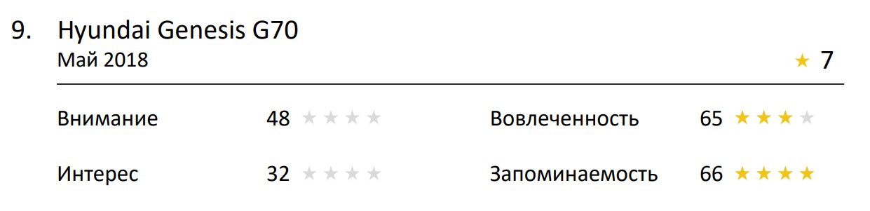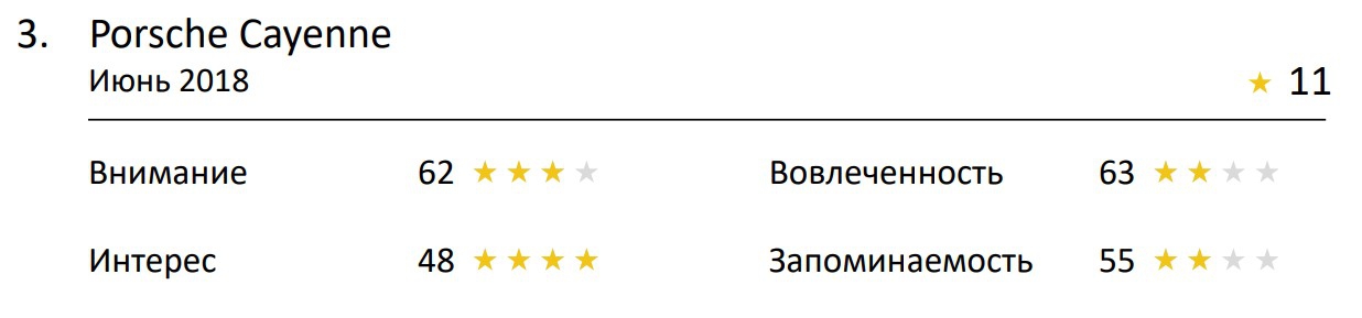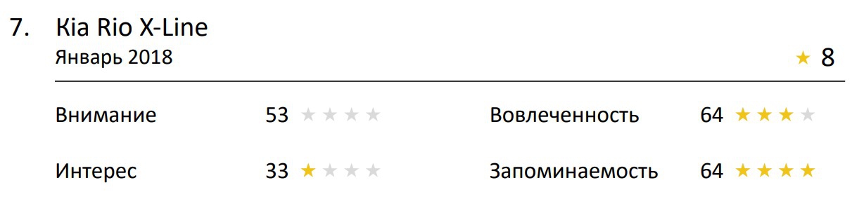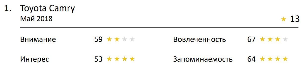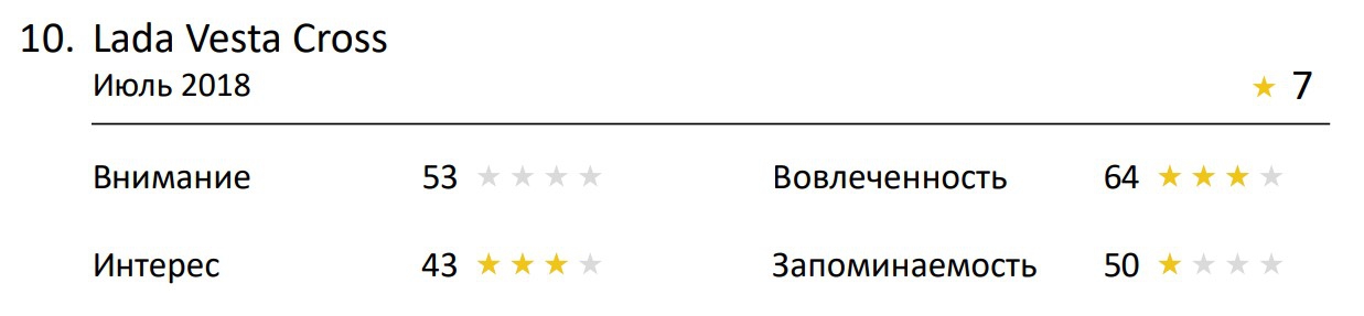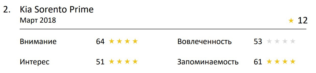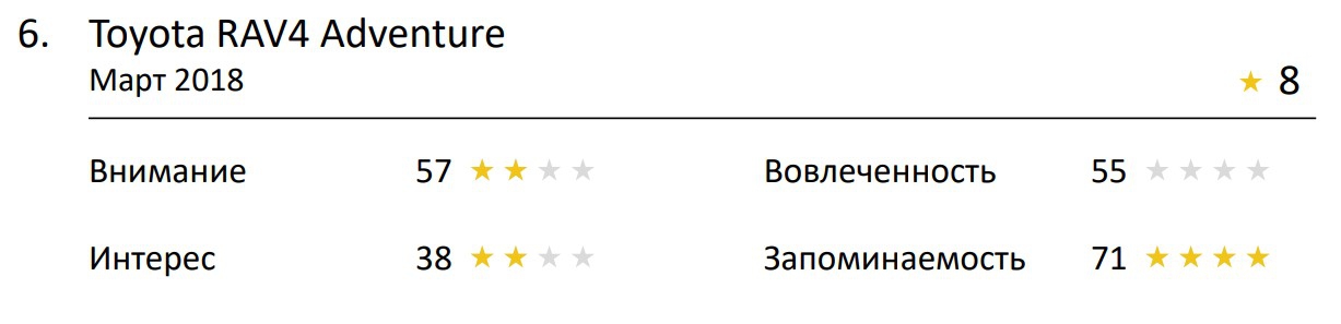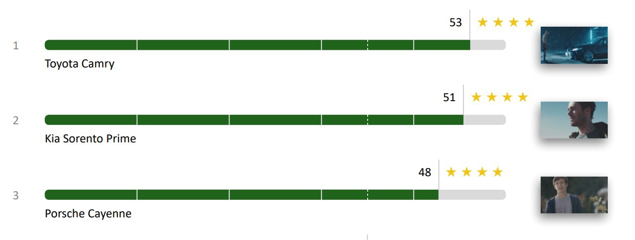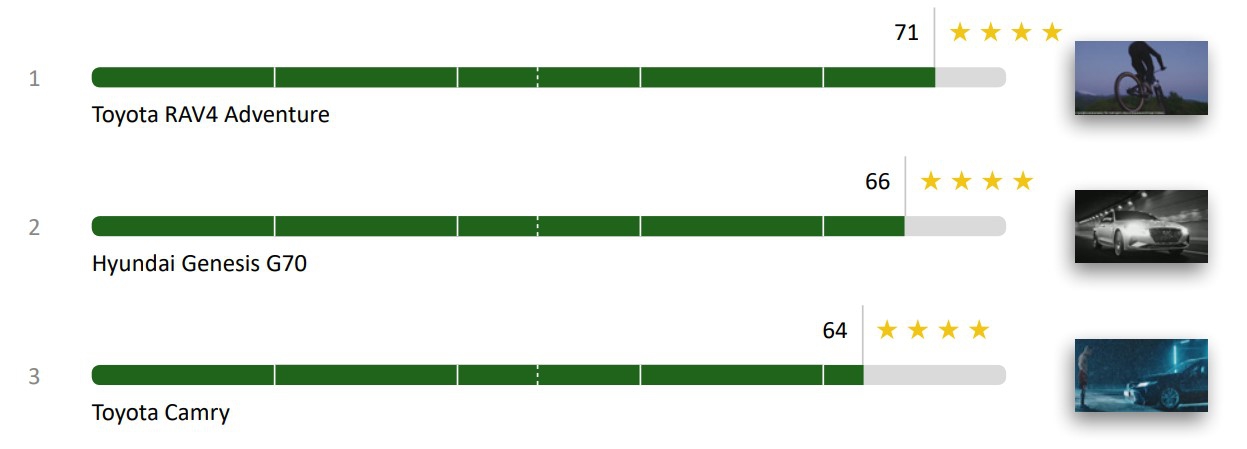 Выяснилось, что реклама автомобилей хорошо запоминается зрителями. Ровно половина роликов из подборки показала высокий результат по данному критерию. Среди наиболее запоминающихся: Kia Sorento Prime (61 балл), Кia Rio X-Line и Toyota Camry (по 64 балла), Hyundai Genesis G70 (66 баллов) и лидер рейтинга Toyota RAV4 Adventure, достигший отметки в 71 балл. Меньше всего зрителям запомнился ролик Lada Vesta Cross.