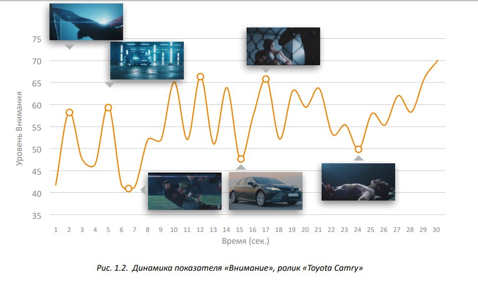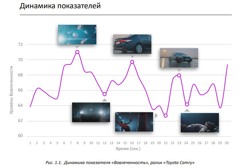 Выраженные колебания эмоциональной вовлеченности связаны с чередованием агрессивных сцен с демонстрацией красивой машины, с которой ничего не происходит. За время демонстрации машины зритель успевает «расслабиться». Это создает необходимую динамичность восприятия. Если делать подряд несколько сцен, вызывающих сильную эмоцию, реакция притупляется и показатели эмоциональной вовлеченности на те же сцены будут ниже.