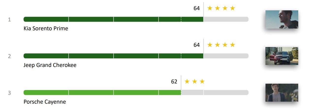 Среди немногих роликов, которым удалось привлечь на себя внимательный взгляд зрителя, оказались Kia Sorento Prime и Jeep Grand Cherokee. Они разделили между собой первое место, набрав по 64 балла.