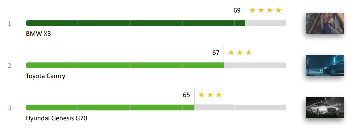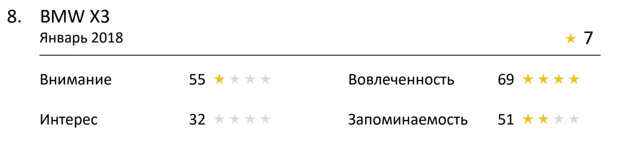 Лучшая автомобильная реклама по показателю «Эмоциональная вовлеченность» у BMW X3. По результатам исследований она набрала максимум — 69 баллов.