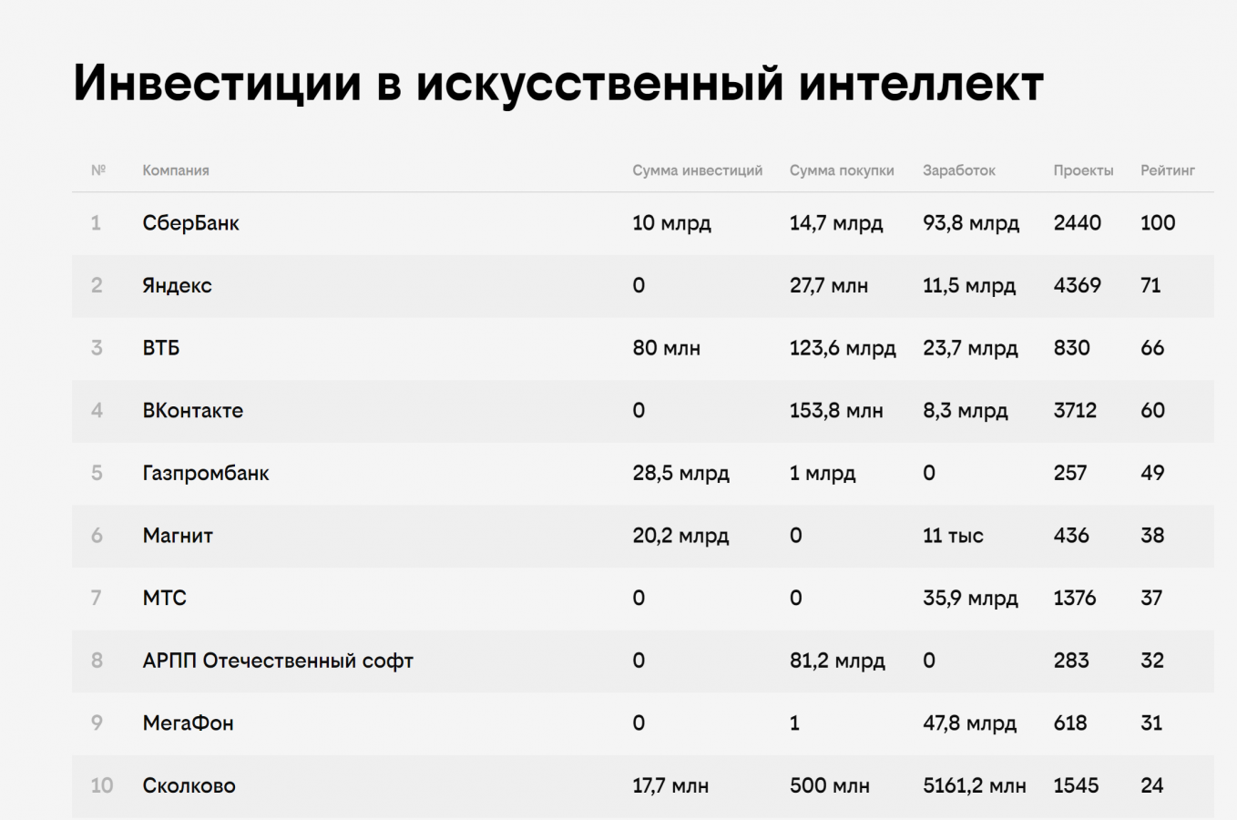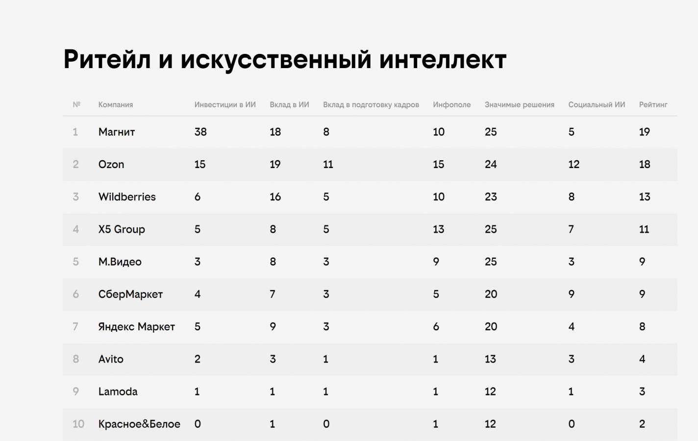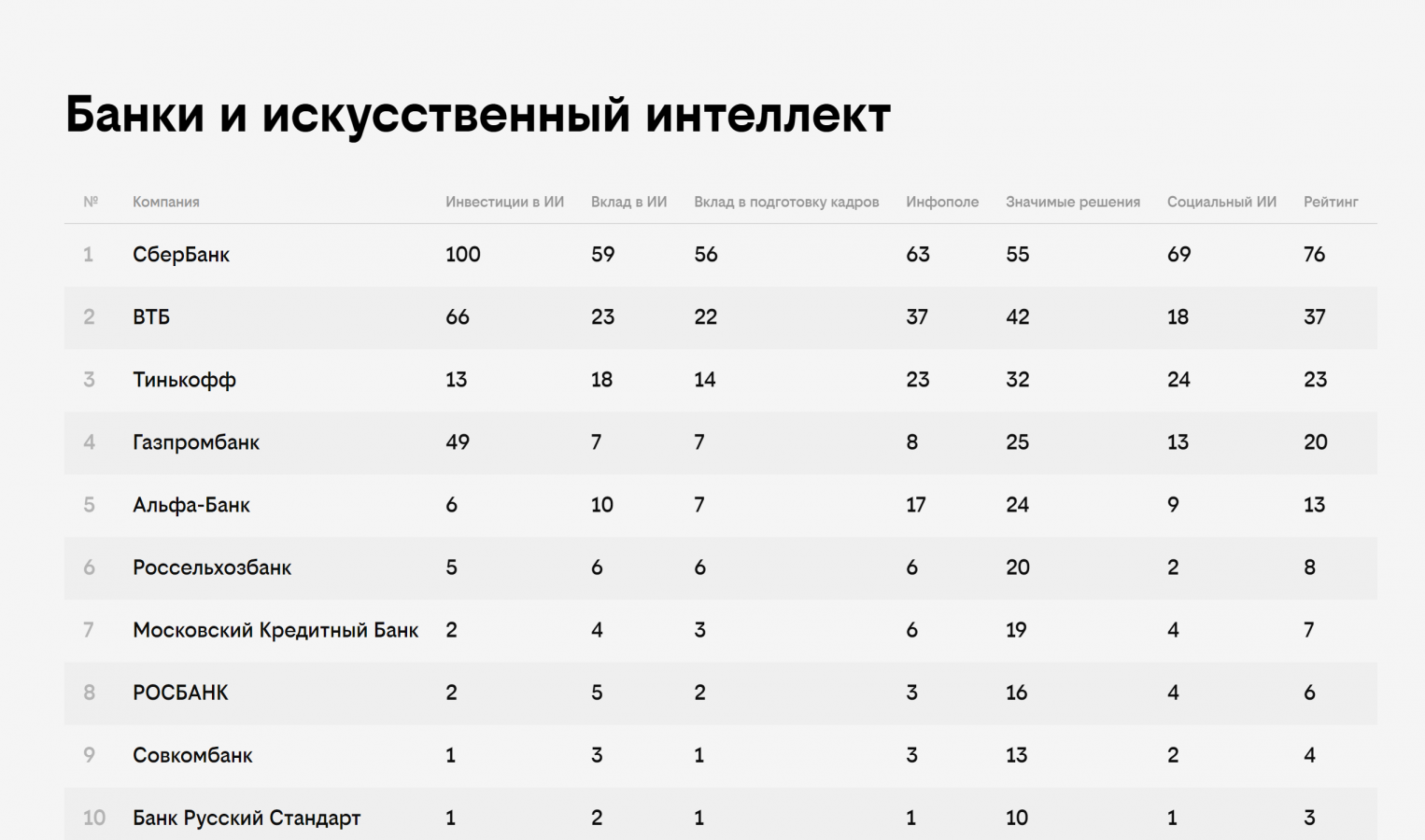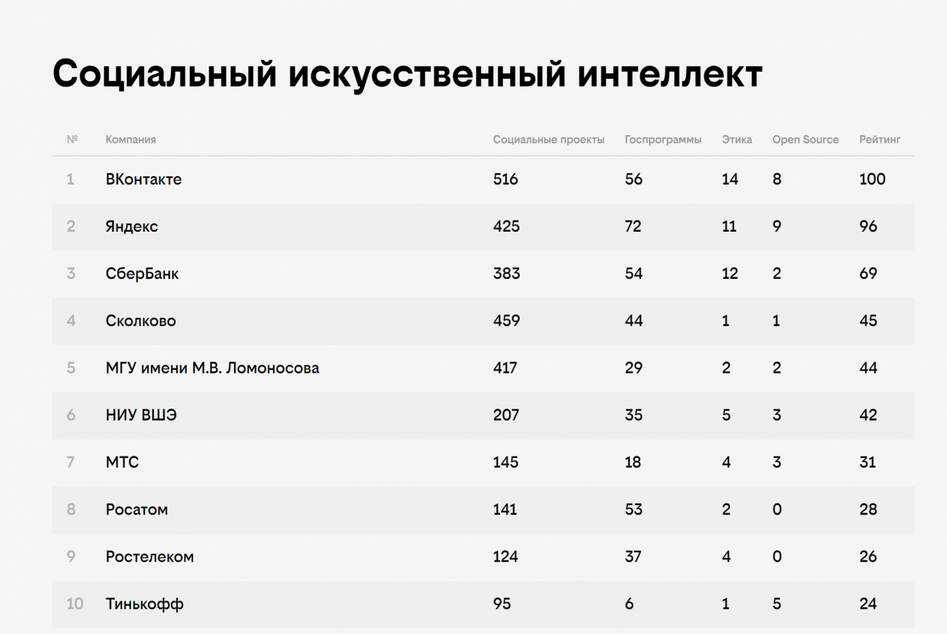 В рейтинге всего 12 номинаций, восемь основных: «Инвестиции в искусственный интеллект», «Вклад в развитие искусственного интеллекта в Российской Федерации», «Вклад в подготовку кадров», «Присутствие в инфополе», «Значимые решения», «Облачные решения», «Импортозамещение», «Социальный искусственный интеллект». И четыре специальных номинаций: «Вузы и искусственный интеллект», «Банки и искусственный интеллект», «Телеком и искусственный интеллект», «Ритейл и искусственный интеллект».