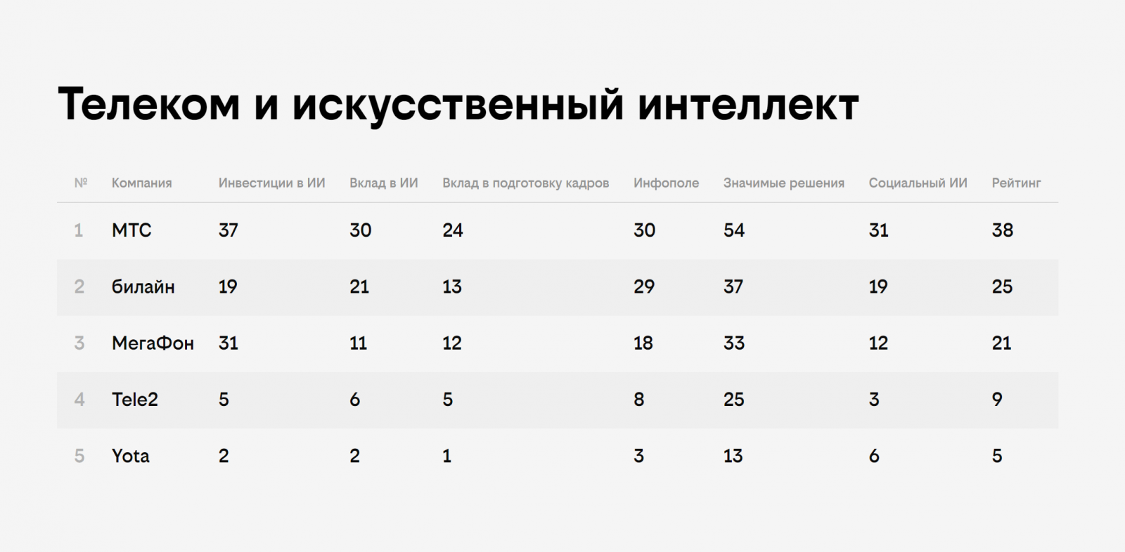 Мы хорошо понимаем, что участникам рынка важно не только отслеживать новости в области ИИ, но и иметь перед глазами навигатор компаний и решений в этой важнейшей для нашего с вами будущего отрасли. Представленный «Билайном» совместно с Brand Analytics рейтинг ИИ претендует, как раз, на место такого навигатора.Рейтинг одновременно учитывает и медийную активность игроков, и внимание к теме и компаниям со стороны СМИ, и «народное» обсуждение в социальных медиа, в данном случае — в Telegram-каналах. Смотреть на ситуацию с трех сторон кажется очень перспективным подходом.