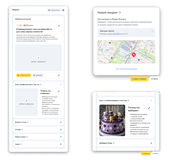 - блок с формой сбора заявок, чтобы страница напрямую приносила заказы (для организаций, которые уже зарегистрированы в Яндекс Бизнесе);