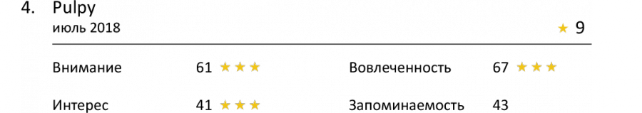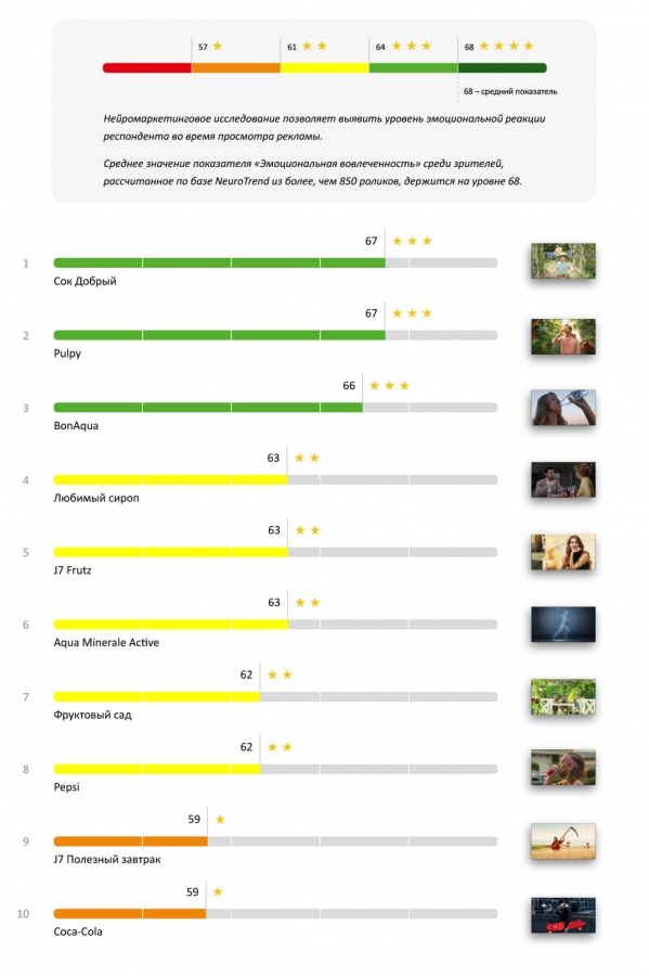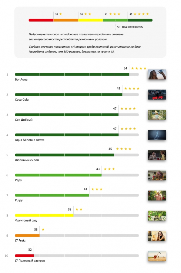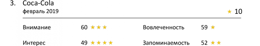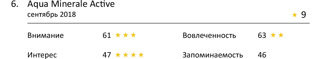 Менее внимательно зрители наблюдали за рекламой Aqua Minerale Ac-tive (61 балл), Pulpy (61 балл) и Coca-Cola (60 баллов). Ни одна из них не смогла добраться до отметки «средний показатель», но свои 3 звезды они все же получили.