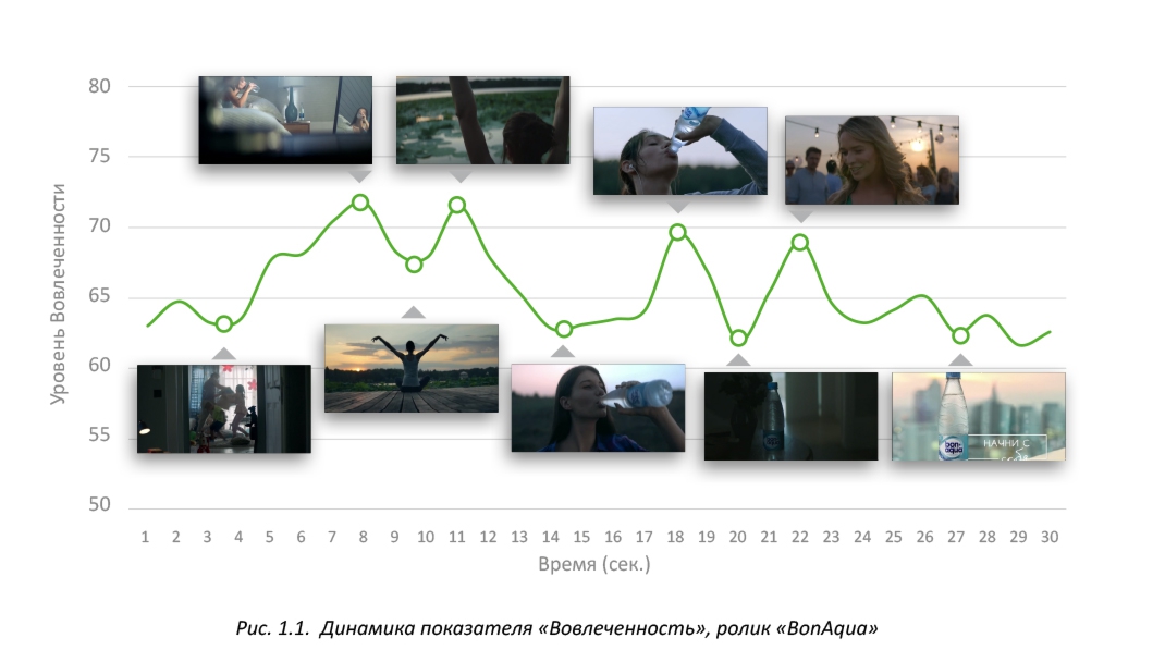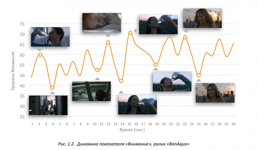Вегетативные реакции, которые связаны с эмоциями (вовлечённость и знак эмоции (позитивная она или негативная), отстают на 2 секунды от внимания. На данном графике представлена кривая, которая показывает изменение уровня внимания и вовлеченности во время просмотра рекламного ролика.