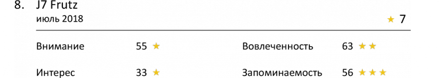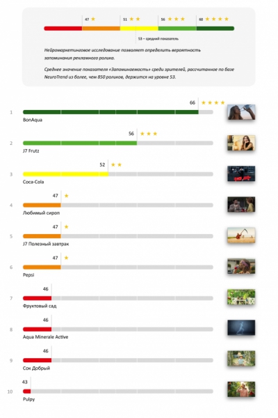 Несмотря на огромный разрыв между 1 и 2 местом, реклама J7 Frutz все же смогла получить 3 звезды по Запоминаемости. Coca-Cola также оказалась в первой тройке, но оценки этого ролика по показателю слабые. Реклама получила всего 52 балла.
