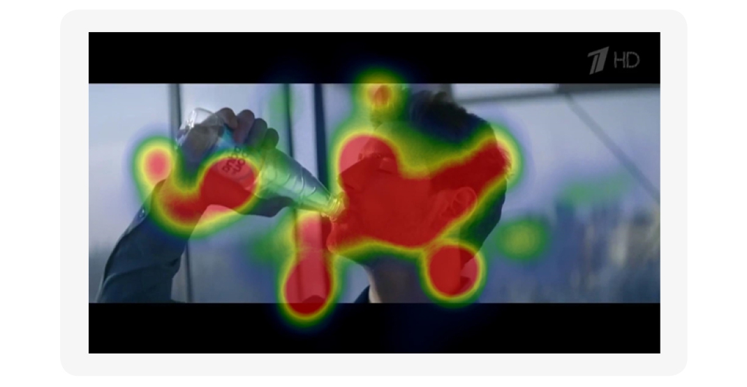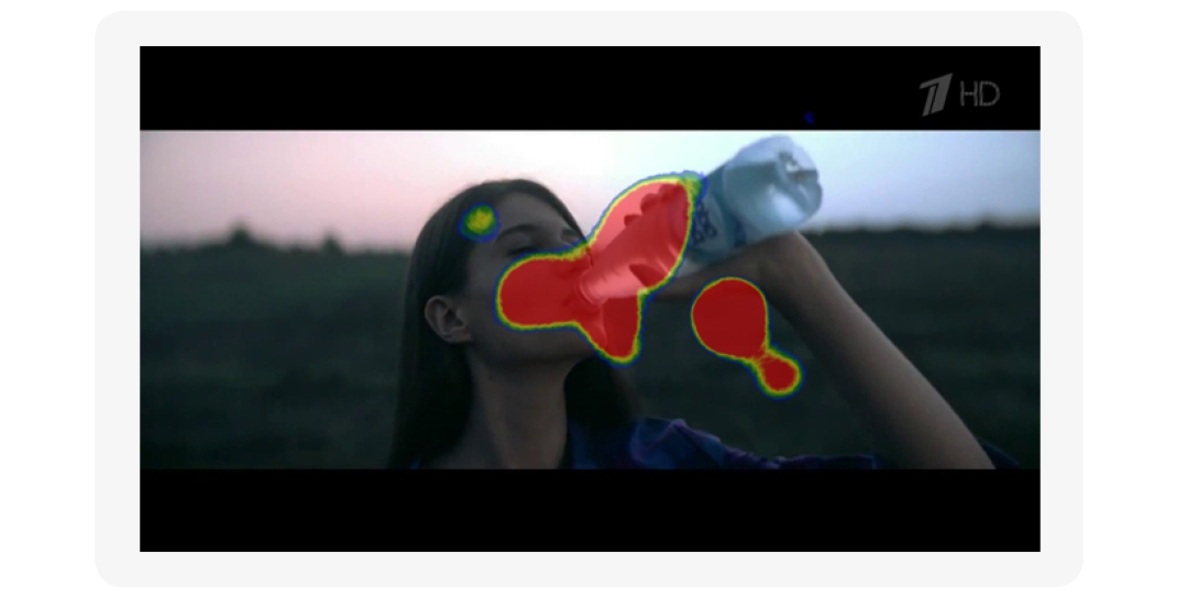 В чем же причина низких показателей внимания? Как мы уже говорили, больше трети ролика показывается, как люди пьют воду. Взгляд быстро фиксируется на том, на чем необходимо — на бутылке и логотипе. Но ведь невозможно 10 секунд смотреть на одно и то же, взгляд начинает блуждать по экрану, показатель когнитивного внимания падает. Причем можно сказать, что длительный просмотр того, как люди пьют воду, надоедает и раздражает — этому соответствует небольшое увеличение вовлеченности на фоне сильного и длительного падения эмоциональной валентности. С этим перестарались.