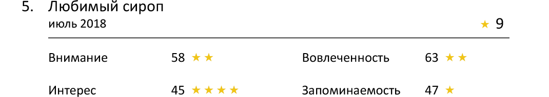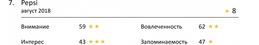 Pepsi и «Любимый сироп» недостаточно проявили себя, чтобы войти в топ этого рейтинга. Внимание зрителей к ним оценивается всего в 59 и 58 баллов, за которые ролики можно наградить всего 2 звездами.