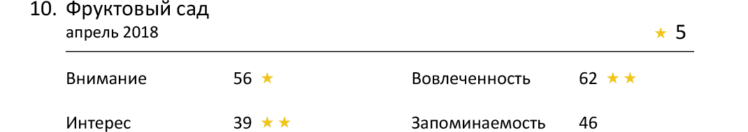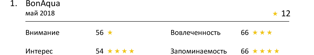 Безусловным лидером здесь становится реклама BonAqua. Она заметно опережает своих соперников и с большим отрывом выходит вперед с 4 звездами и 66 баллами. Зритель хорошо запомнил ролик, и потому рекламируемый напиток будет иметь преимущества в момент принятия решения о покупке.