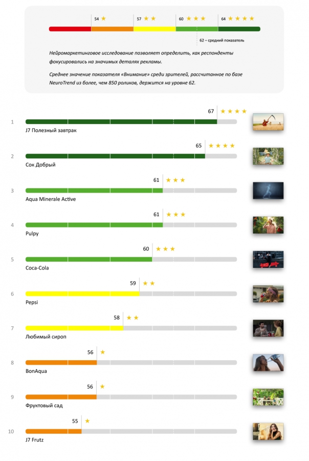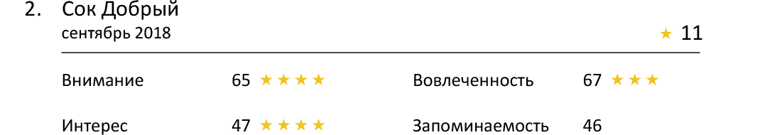 На этот раз мы предложили респондентам посмотреть рекламные ролики безалкогольных напитков и в процессе исследования выявили два из них, которые получили больше всего баллов по показателю «Внимание». Этими роликами стали «J7 Полезный завтрак», занявший лидирующую позицию, и «Сок Добрый», оказавшийся на втором месте, но получивший все 4 звезды.