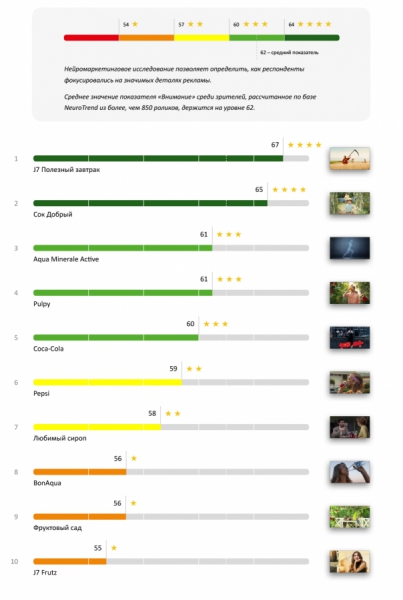 Новое исследование было решено проводить на основе 10 рекламных роликов безалкогольных напитков. Традиционно в «НейроВизор» вошла реклама, которая транслировалась на ТВ в течение года.