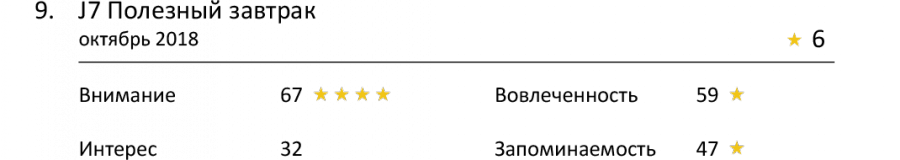 А вот «J7 Полезный завтрак», видимо, потратил все силы на привлечение внимания, и на категорию «Интерес» их просто не осталось. Ролик получил 32 балла и ни одной звезды.
