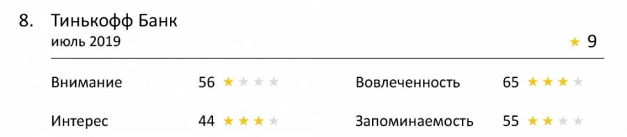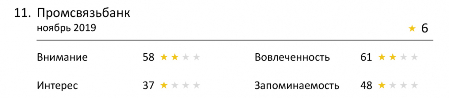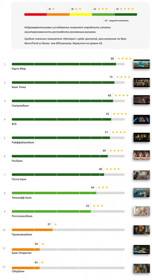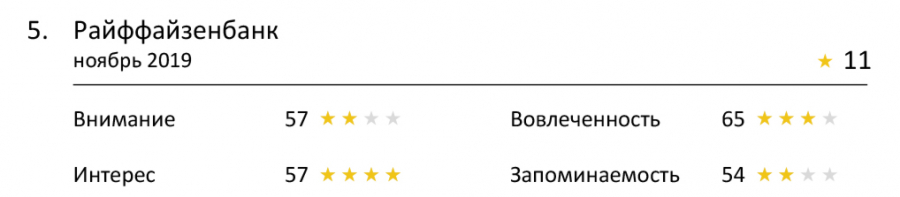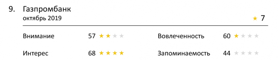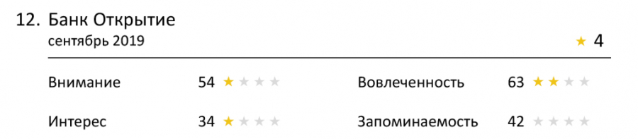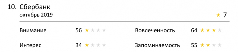 Менее успешной в этой категории оказалась реклама «Промсвязьбанка», банка «Открытие» и Сбербанка. Ролики получили всего одну звезду, а это значит, что над показателем «Интерес» еще нужно поработать.
