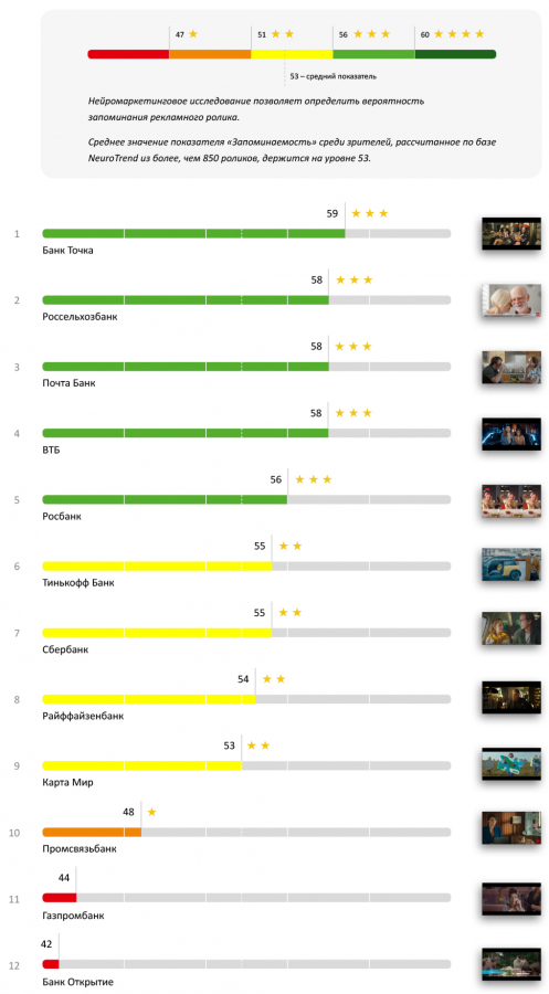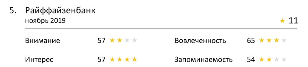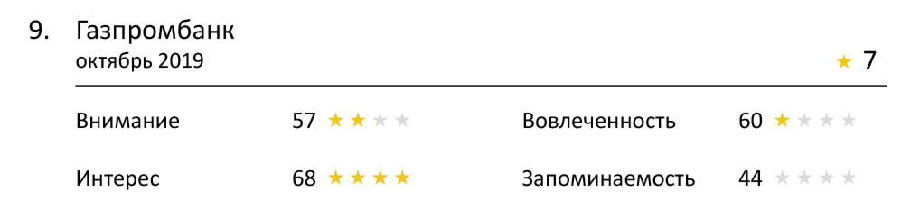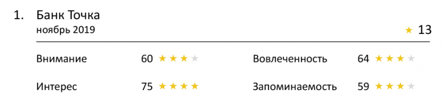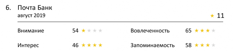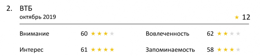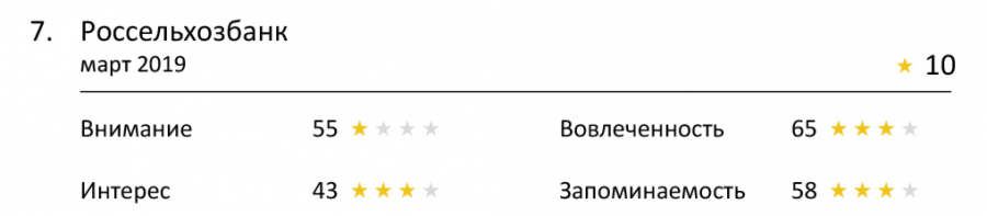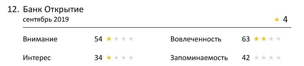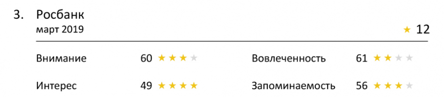 Банк «Точка», «Россельхозбанк» и «Почта Банк» сохранили свое первенство после «Эмоциональной вовлеченности», а вот остальные лидеры опустились на категорию ниже. Но, как говорится, «свято место пусто не бывает»: на их позиции уверенно встали ВТБ и «Росбанк», поднявшись из двухзвездной категории по предыдущему критерию. А вот кому совсем не удалось запомниться зрителям, так это рекламе «Газпромбанка» и банка «Открытие». Ролики оказались на нижней позиции рейтинга и не попали ни в одну звездную категорию.