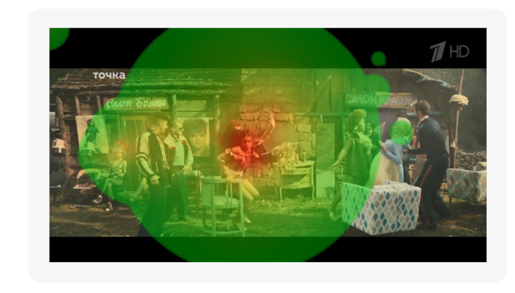 Когнитивное внимание при этом снижается, так как присутствует большое количество интересных, смешных деталей, которые за короткое время трудно рассмотреть. Мы видим на тепловой карте это блуждание взгляда — нет ярко выраженных красных пятен, которые свидетельствовали бы о том, что внимание всех респондентов привлек какой-то один объект.