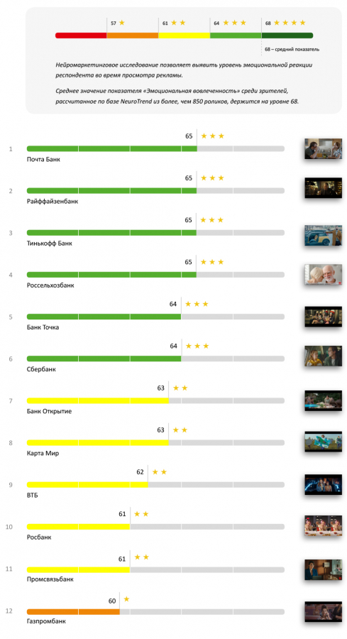 Учитывая это, можно сказать, что половина рекламной подборки все же смогла дотронуться до струн зрительской души и вызвать эмоциональную реакцию. Больше всего баллов в этой категории набрали «Почта Банк», «Райффайзенбанк», «Тинькофф Банк» и «Россельхозбанк». Все они заработали 65 баллов и получили три звезды.