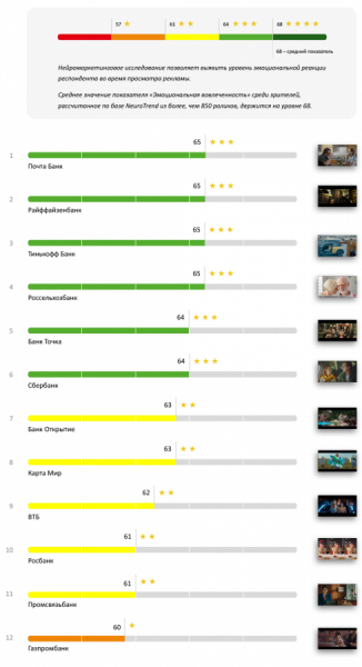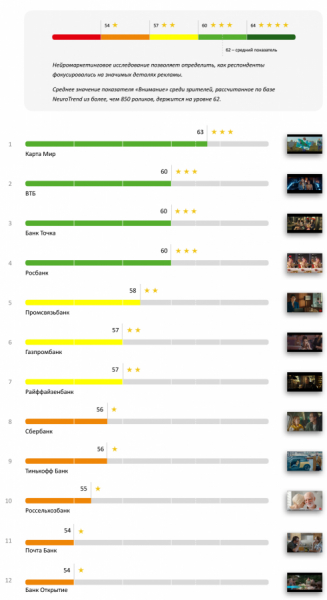 Тем не менее, лучше всех с этой задачей удалось справиться рекламе карты «Мир», ВТБ, банка «Точка» и «Росбанка». Все они получили три звезды и забрали на себя большую часть внимания. В желтом секторе оказались три ролика: «Промсвязьбанк», «Газпромбанк» и «Райффайзенбанк». Это не очень высокий результат, но, учитывая низкий уровень внимания к банковским роликам в целом, две звезды — неплохой показатель. Остальные пять роликов зрители смотрели с наименьшим вниманием, поэтому реклама получила всего одну звезду.
