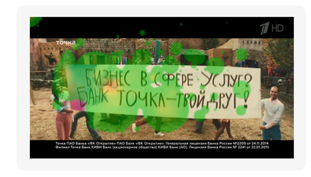 Сложно ли привлечь внимание зрителей к рекламе, когда дело доходит до серьезной и строгой банковской сферы? Результаты исследования показывают, что да. Ни один из роликов не попал в темно-зеленую зону и не смог сохранить на себе пристальный взгляд зрителя.