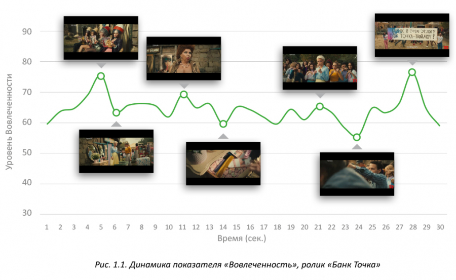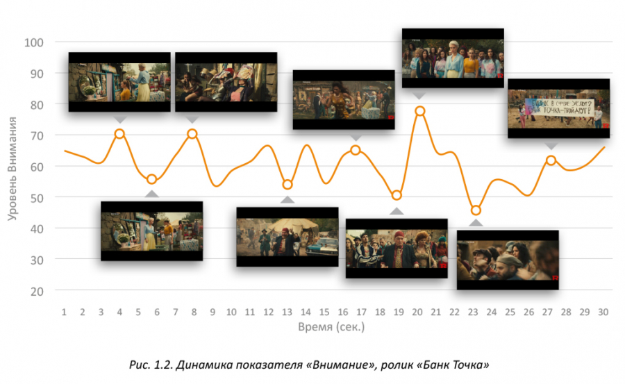 Дальше с 23 по 27 секунду происходит снижение когнитивного внимания. Это связано с разнонаправленным движением персонажей в потасовке, трудно сфокусировать взор на чем-то одном. При появлении слогана и демонстрации его несколько секунд, естественно, внимание приковано к нему. При этом повторяется рефрен песни «И в точку, и в точку».