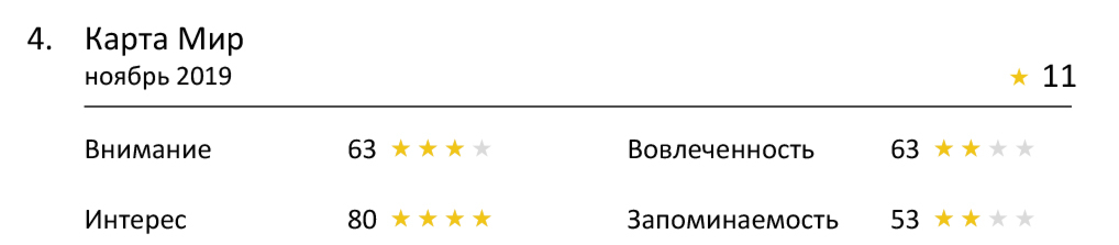 Реклама карты «Мир», можно сказать, произвела фурор. Ее результат почти в два раза выше среднего значения, и мы должны отдать должное ее создателям: они действительно постарались на славу. Но на этом интересности не заканчиваются.