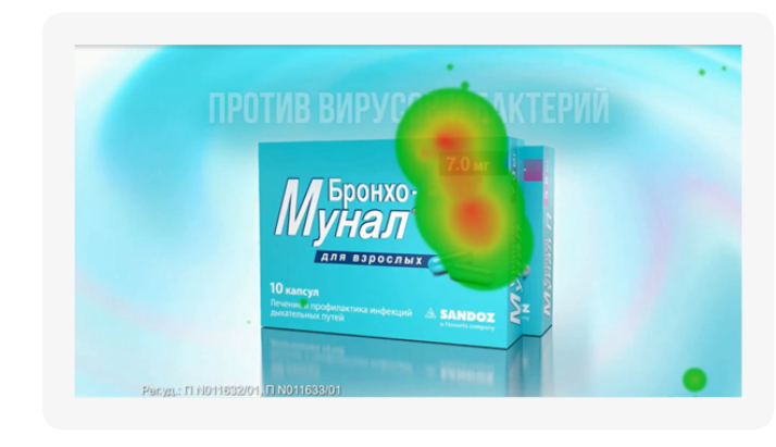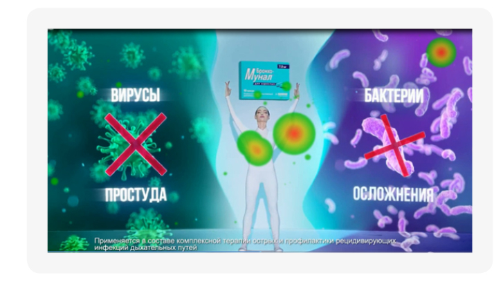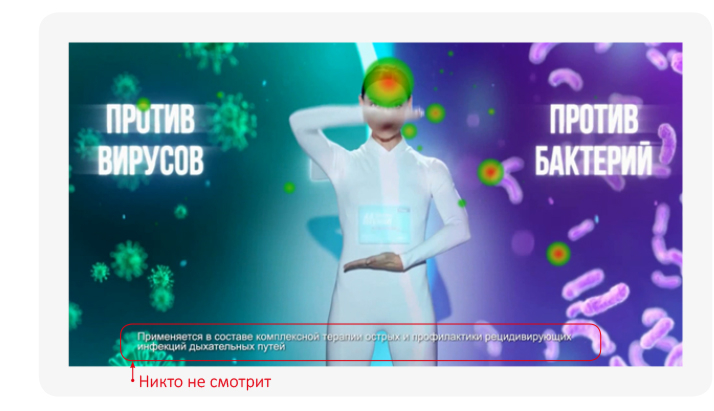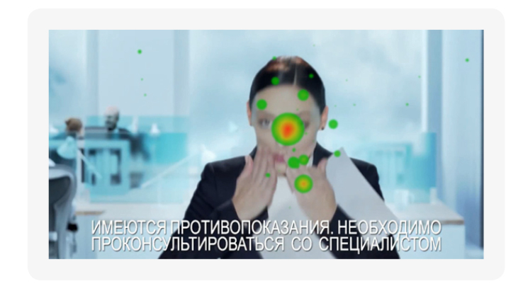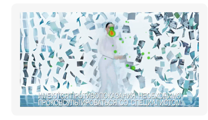 Итак, подводя итоги, можно сказать, что несмотря на довольно обычный сюжет — рассказ об основных действиях препарата — ролик имеет высокие показатели внимания благодаря грамотному сочетанию интересного лица девушки, красивых грациозных движений и отсутствию четких объектов привлечения внимания на заднем плане.