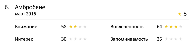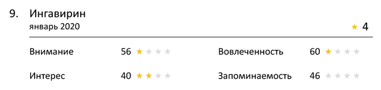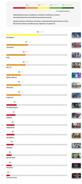 По всей видимости, интересный сюжет — это не самая сильная сторона рекламы противопростудных средств. Наиболее высокий балл получил ролик «Ингавирина» всего с двумя звездами. Результат остальной подборки оставляет желать лучшего. 8 из 15 роликов отмечены красным, а это значит, что они не получили ни одной звезды и не смогли заинтересовать зрителей.
