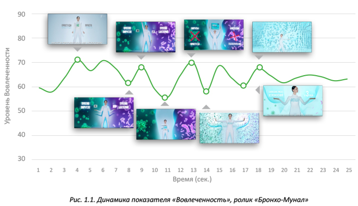 Вегетативные реакции, которые связаны с эмоциями (вовлечённость и знак эмоции (позитивная она или негативная), отстают на две секунды от внимания. На данном графике представлена кривая, которая показывает изменение уровня внимания и вовлеченности во время просмотра рекламного ролика.