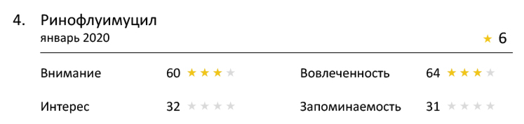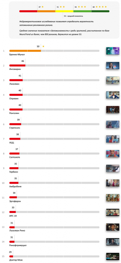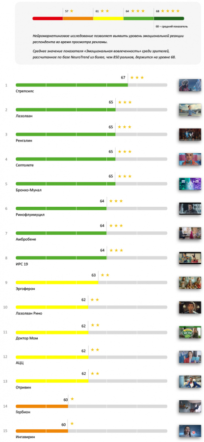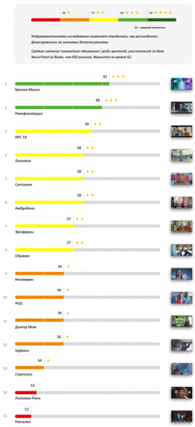 В этом рейтинге специалисты собрали большую подборку из 15 рекламных роликов противопростудных средств. Но несмотря на такой обширный список, реклама показала довольно низкий результат по критерию «Внимание».