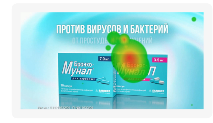 Следующий пик повышения когнитивного внимания связан с демонстрацией крупным планом двух упаковок препарата — для взрослых и детей. Несмотря на то, что препарат рекламировала взрослая девушка, больше внимания привлек детский вариант. Все внимание направлено именно на него. И это длится почти три секунды.