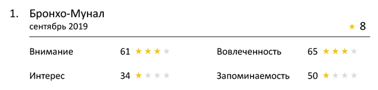 Единственный, кто смог выделиться среди остальных — это ролик «Бронхо-Мунала». И хотя одна звезда не лучший показатель, рекламу все же стоит отметить с положительной стороны, учитывая, что она почти попала в желтый сектор.