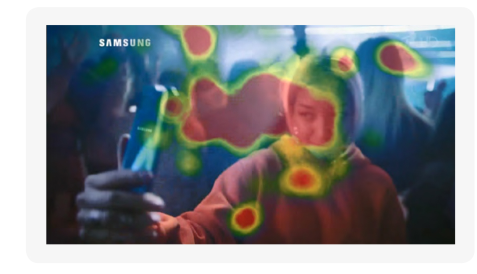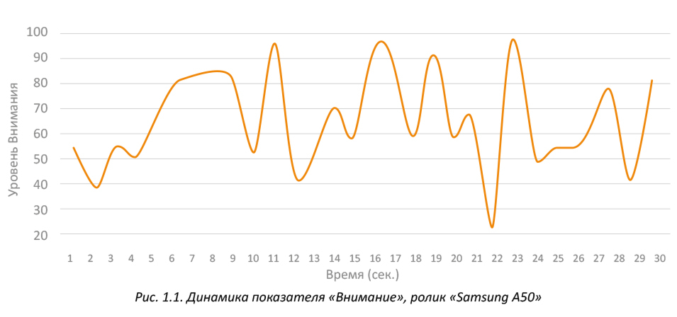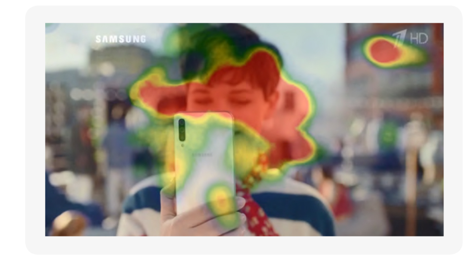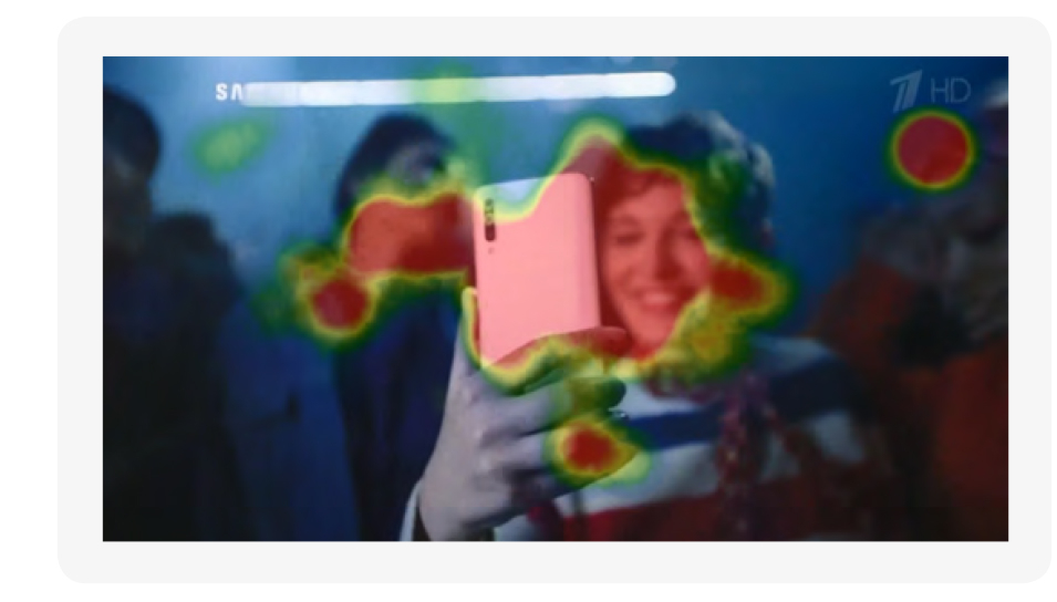 Еще один важный прием, который способствует повышению показателя когнитивного внимания, который еще не так давно не был так распространен, как сейчас — обращение внимания на селфи. Современные люди внимательно наблюдают, как делают селфи другие. Причем существует определенный паттерн движения глаз — от лица героя, который снимет селфи, на смартфон, которым это все снимается. Зритель как бы экстраполирует, что получится на фото. Этот прием многократно использован в ролике Samsung А50, где все пики внимания приходятся именно на эти эпизоды.