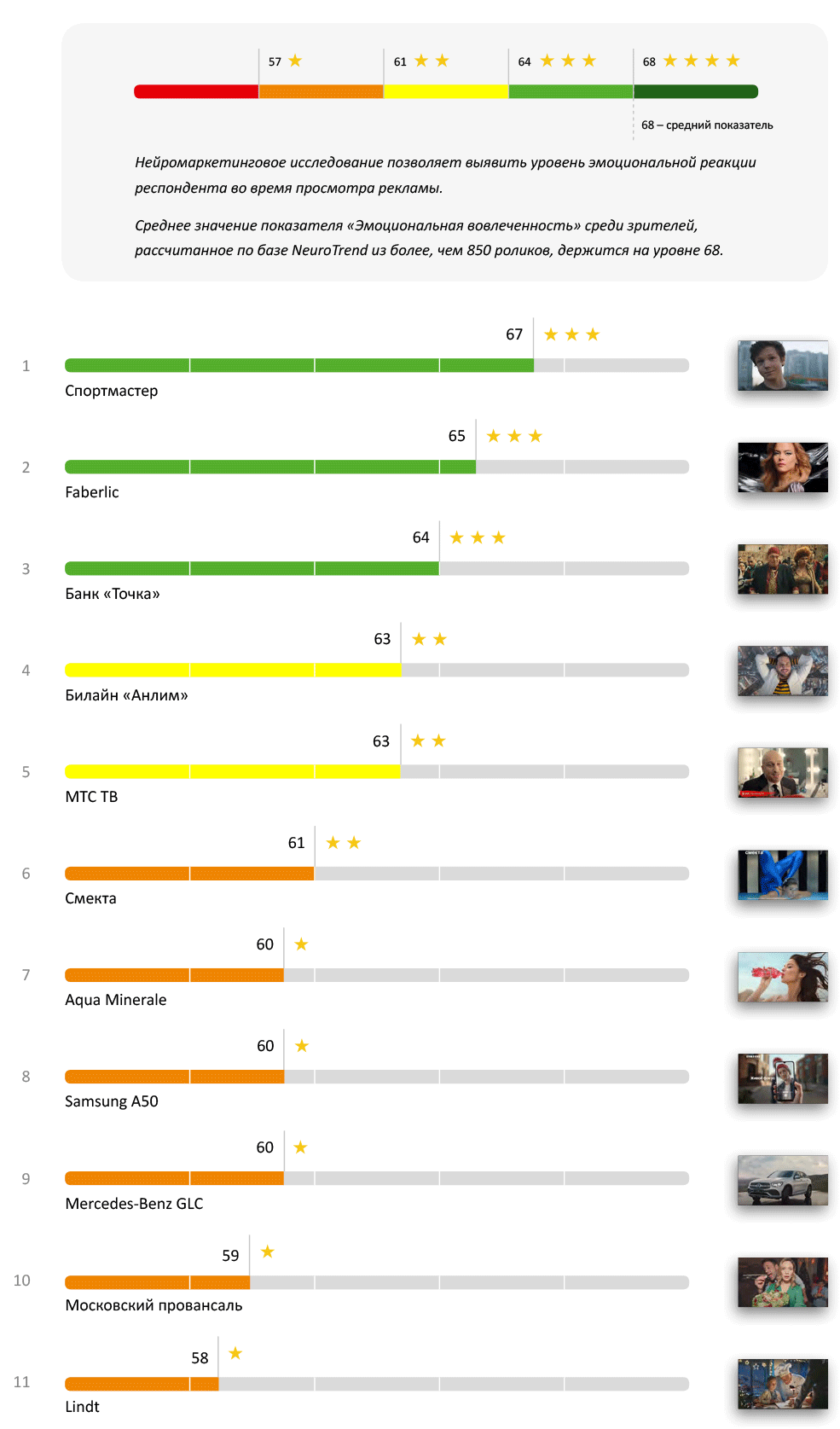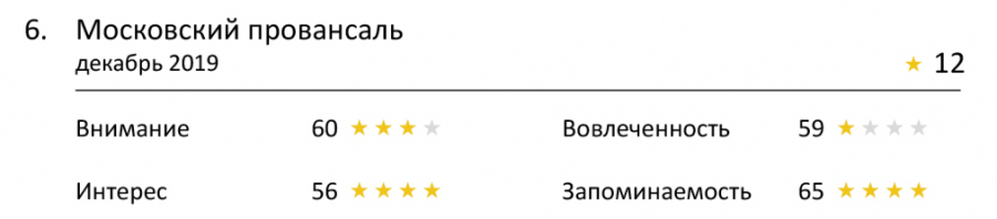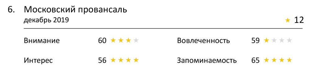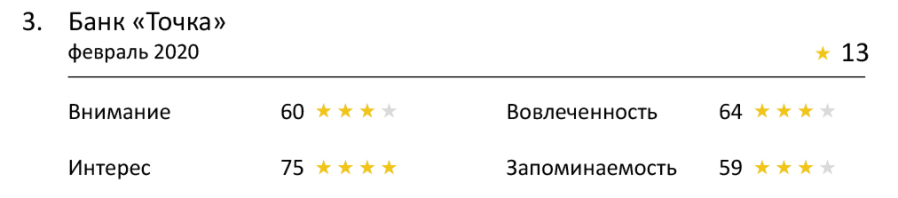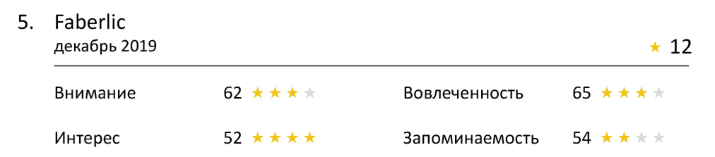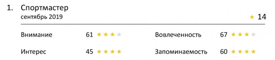 На этот раз дотянуться до четырехзвездной категории не удалось никому. Но учитывая сложность показателя, мы все-таки можем выделить тройку лучших — это «Спортмастер», Faberlic и Банк «Точка». Все они смогли вызвать эмоциональную реакцию у зрителей, и особенно хорошо это удалось «Спортмастеру». Он практически ворвался в топовую категорию, и до четырех звезд ему не хватило всего одного балла.