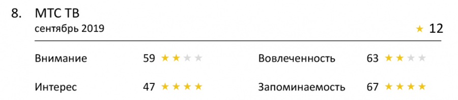 А вот здесь снова все прекрасно! Большая часть подборки хорошо запоминается зрителями, и это отличные новости для рекламодателей. Во время принятия решения о покупке это может сыграть решающую роль, поскольку потребитель помнит товар из рекламы, и ему проще сделать выбор в пользу уже знакомого продукта. Особенно похвалим лидера этого рейтинга — МТС ТВ. Он получил больше всех баллов и прочно закрепился в памяти, несмотря на то, что привлек не очень много внимания.
