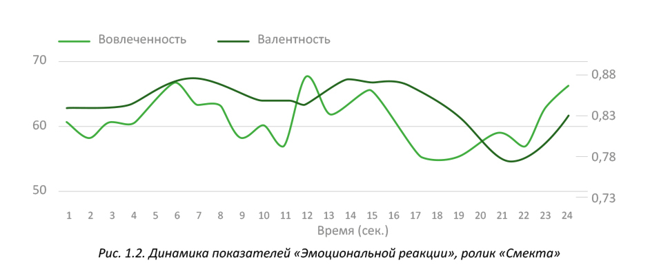 что вызывает скуку у зрителей. Это прекрасно видно на графиках эмоциональной реакции. Видно, как с 15 секунды начинается падение эмоциональной вовлеченности и валентности, что в среднем по ролику вызвало снижение показателя эмоциональной реакции.