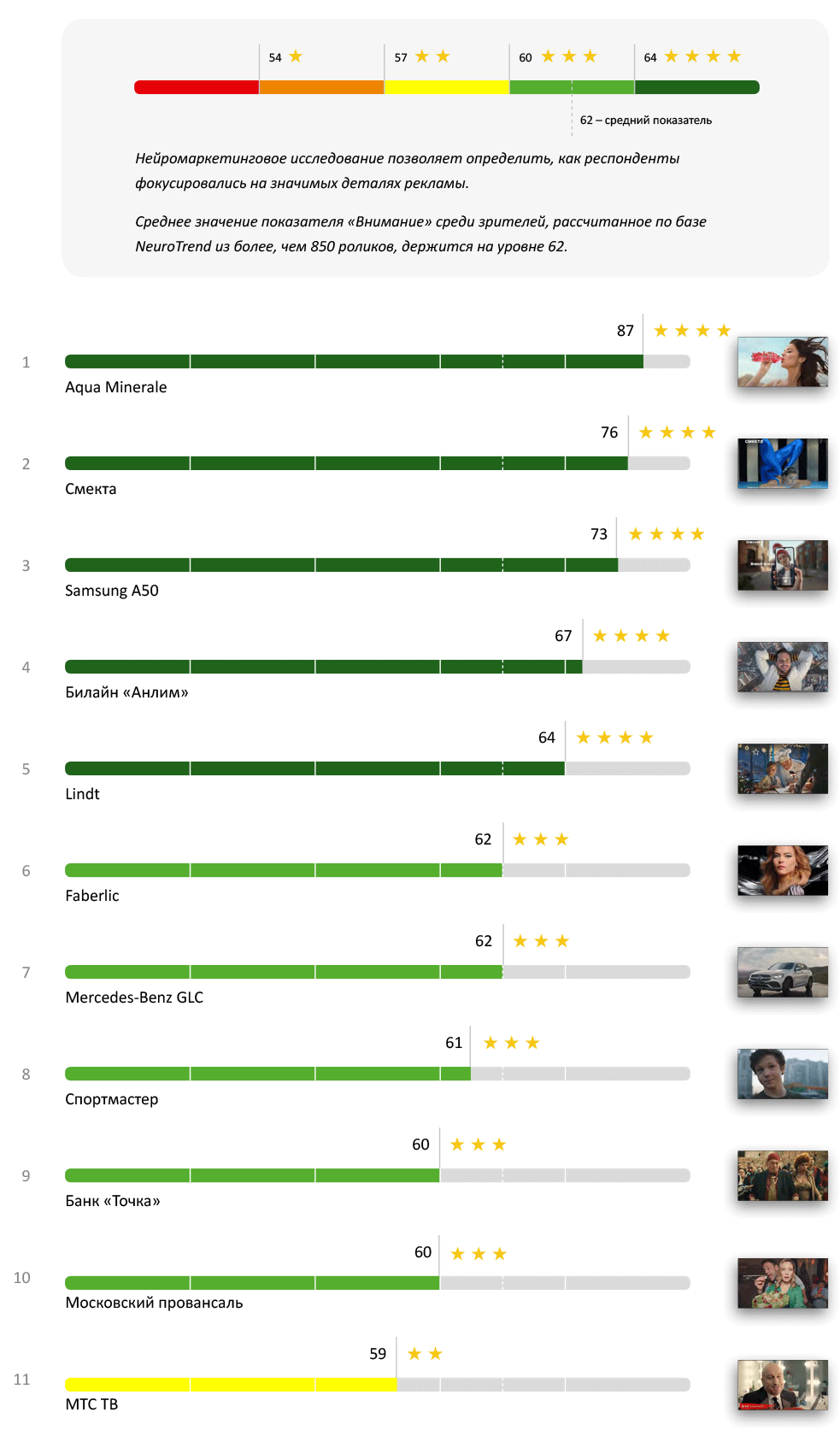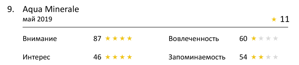 Как и ожидалось, лидеры среди рекламных роликов отлично справляются с привлечением внимания. Многочисленные зеленые полосы в рейтинге прямо сигналят нам о том, что зрители пристально следят за сюжетом каждой рекламы. Особенно отличился ролик Aqua Minerale, заработавший целых 87 баллов. Это лучший показатель этого года, и ему действительно стоит поаплодировать.
