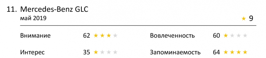 А вот роликам Samsung A50, «Билайн «Анлим»» и Mercedes-Benz GLC сделать такой взрывной сюжет не удалось. И хотя каждый из них способен привлечь внимание, над критерием «Интерес» еще стоит поработать.