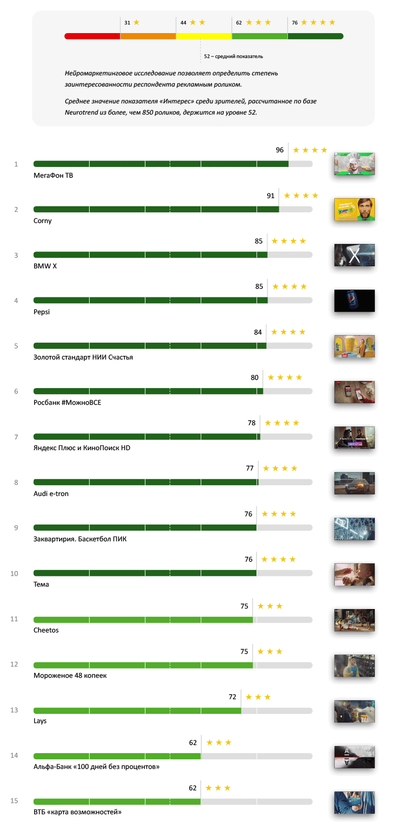 Это тематический нейромаркетинговый рейтинг рекламных видеороликов, которые транслировались на телевидении в течение года. Аналитика от компании «Нейротренд» составляется на основе психофизиологических данных, полученных в ходе исследования потребителей в момент просмотра рекламы. Ролик демонстрируется респондентам, реакция которых замеряется с помощью ЭЭГ, айтрекера и полиграфа. Каждое видео оценивается по одним и тем же параметрам — внимание, интерес, вовлеченность, запоминаемость.