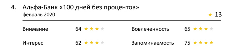Показательно, что четырех звезд не набрали ролики, рекламирующие кредитные карты. «Вовлекаться» в кредиты как-то не хочется.
