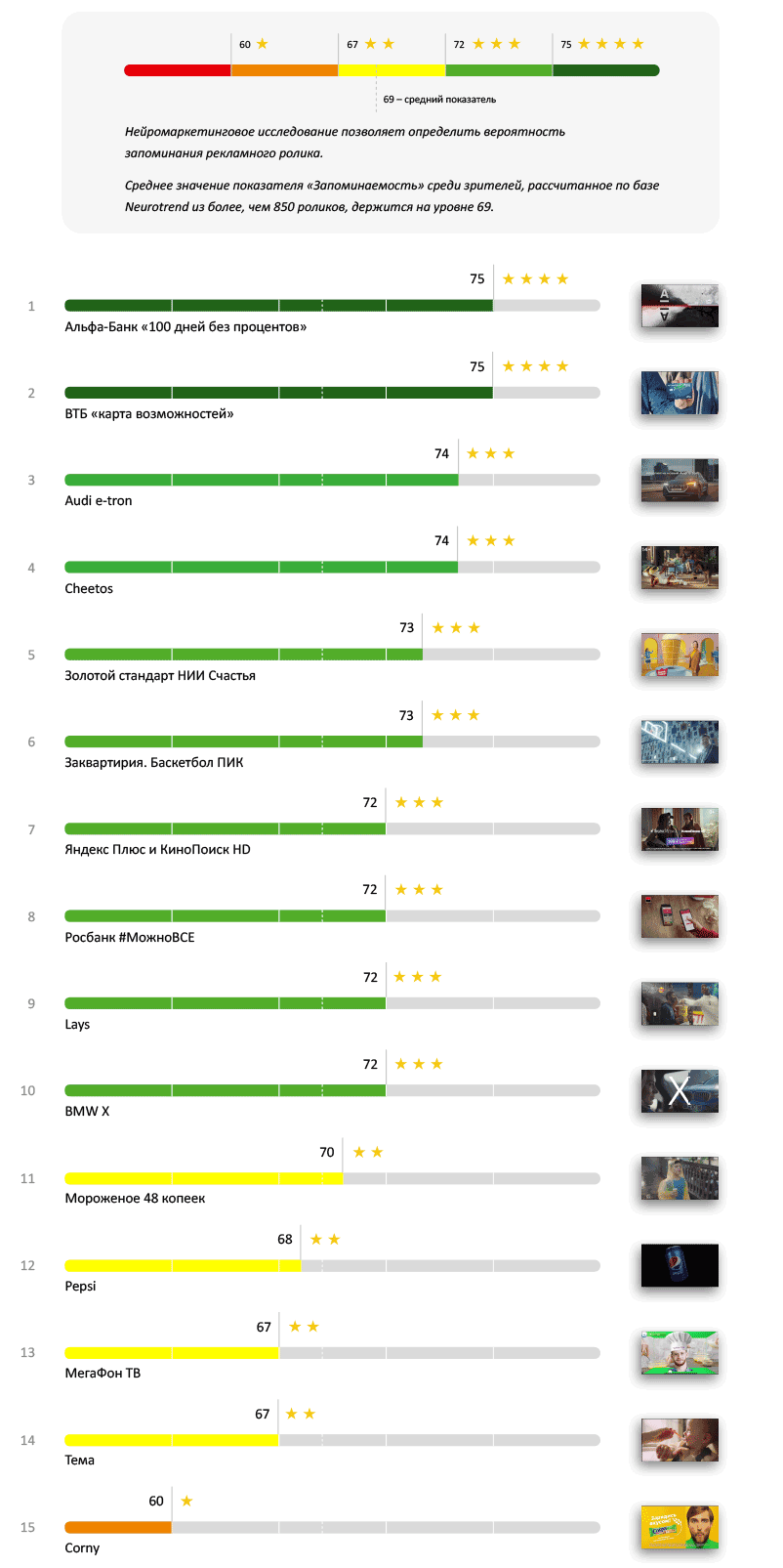 Первое и второе места занимают ролики Corny и МегаФон ТВ. Симпатичные лица с положительными эмоциями крупным планом — у них просто не было шанса не привлечь внимания.
