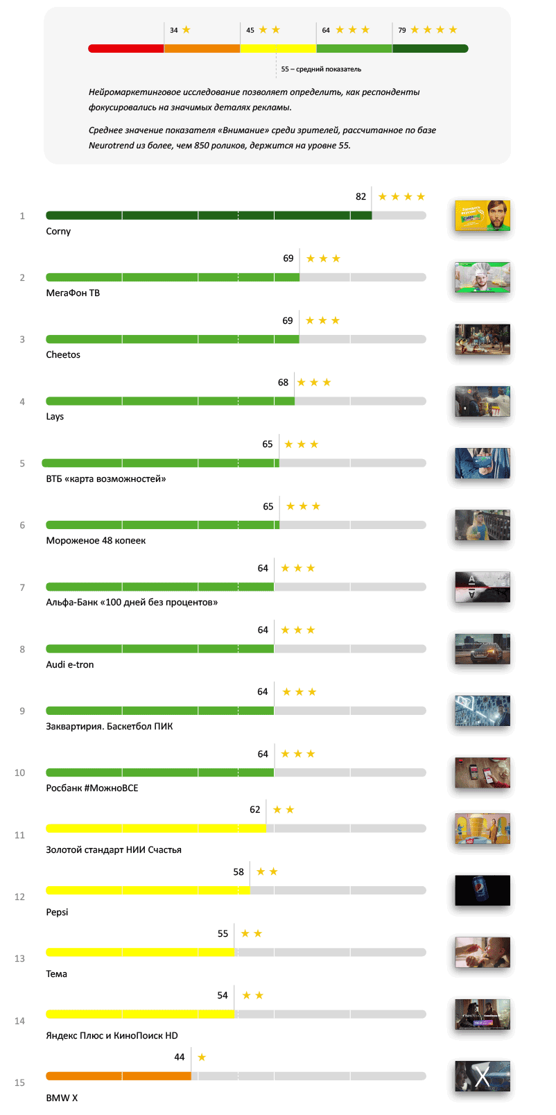 Несмотря на то, что 4 звезды по показателю внимание получили многие ролики, по абсолютным значениям лидером является ролик Corny. Всё дело в том, что большая часть ролика — лица крупным планом. Наш мозг устроен так, что если в поле зрения лицо человека, мы обязательно внимательно смотрим на него.
