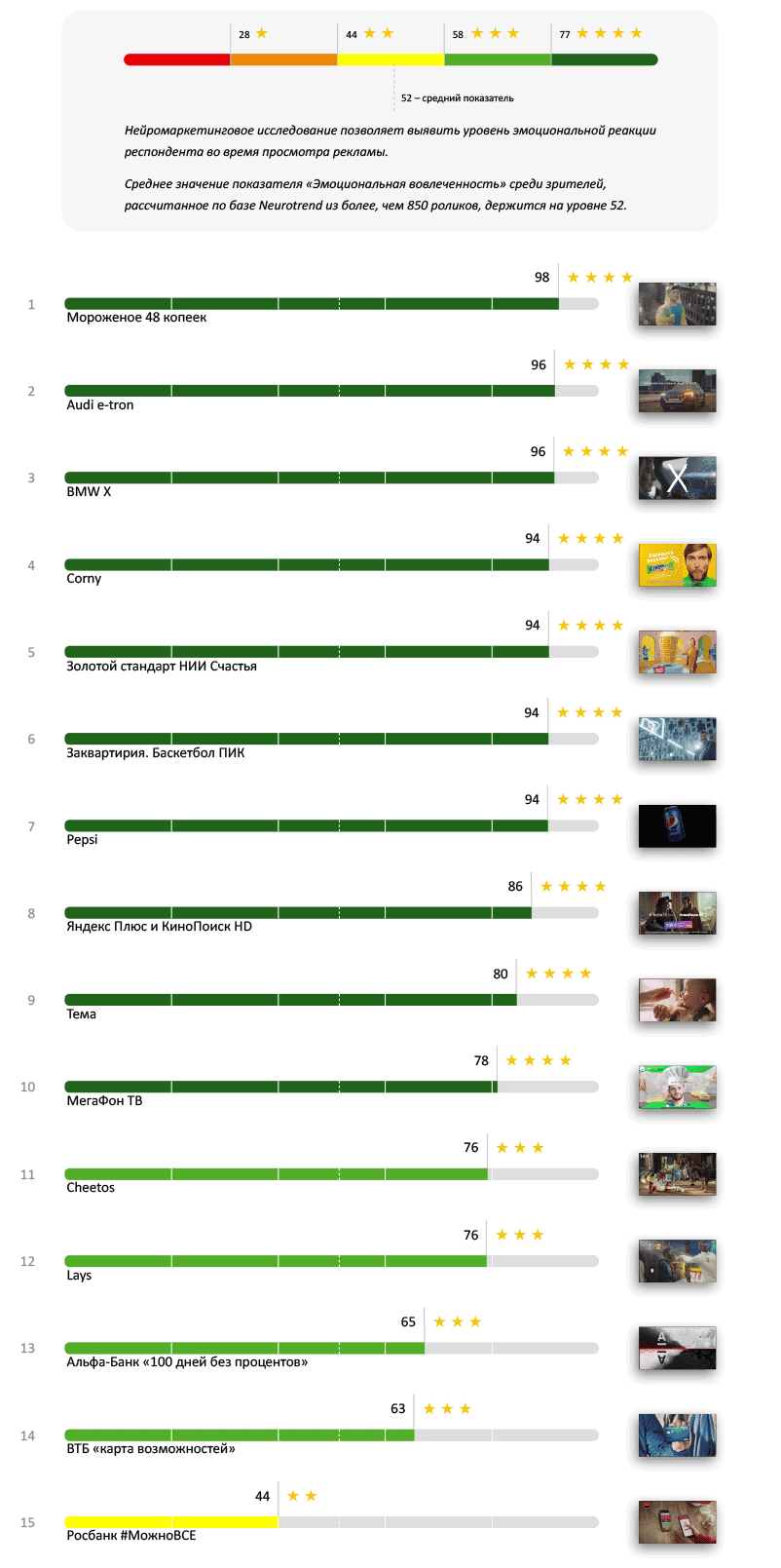 По этому показателю четыре звезды у 10 роликов из 15 — мы с удовольствием вовлекаемся в жизнь, где есть вкусное мороженое, быстрые машины, удобные квартиры и интересные фильмы.