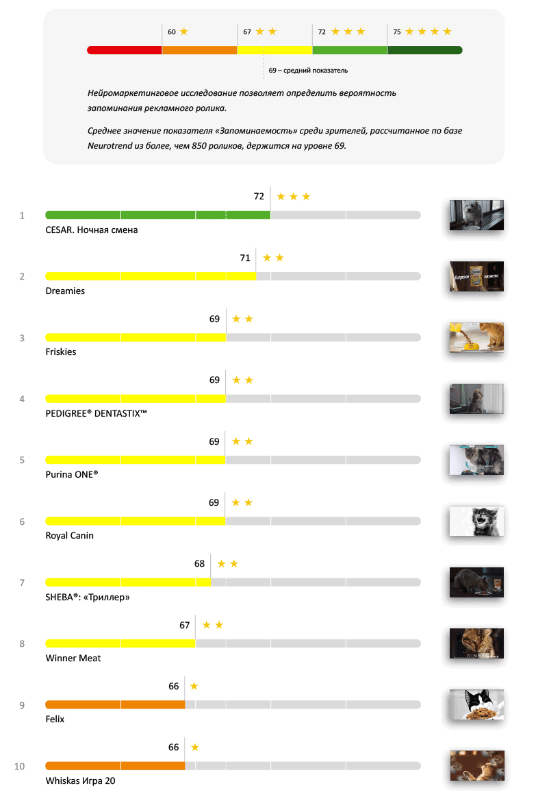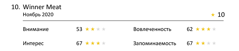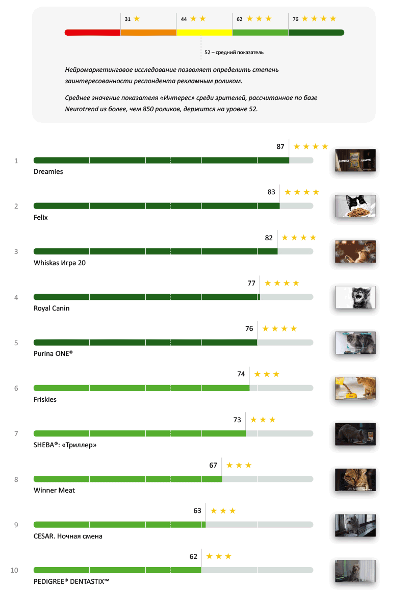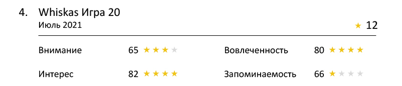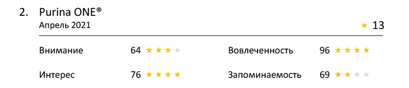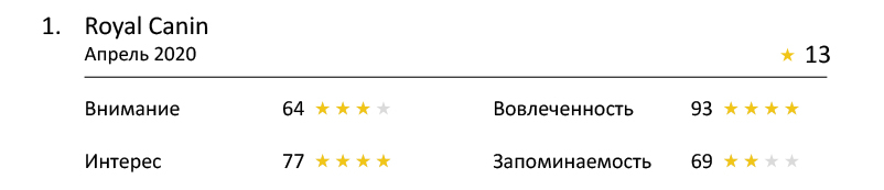 По этому показателю четырёх звёзд не набрал ни один ролик. При этом (в целом) реклама кормов привлекла внимание зрителей: три бренда набрали по три звезды. Интересно, что лидеры вошли ролики, рекламирующие как дорогие корма, так и бюджетные.