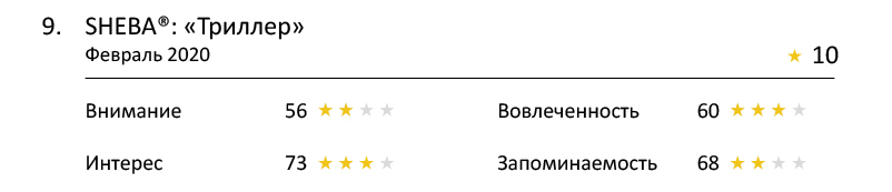 По этому показателю семь из десяти роликов в «жёлтой зоне», а на первое место вышел Cesar «Ночная смена». Это подтвердило уже не раз замеченное наблюдение: хорошо запоминается реклама, в которой рассказана простая и понятная история.
