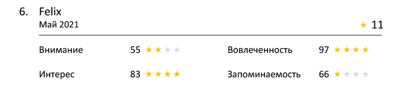 Эмоциональная вовлечённость очень высокая у всех роликах. Все десять работ оказались в «зелёной зоне», восемь из них получили по четыре звезды. Мы, безусловно, реагируем на то, что происходит с нашими домашними любимцами. И всё же на первое место вышел нарисованный, а не живой кот. Он обаятельный и возвращает нас в детство, когда эмоции ярче.
