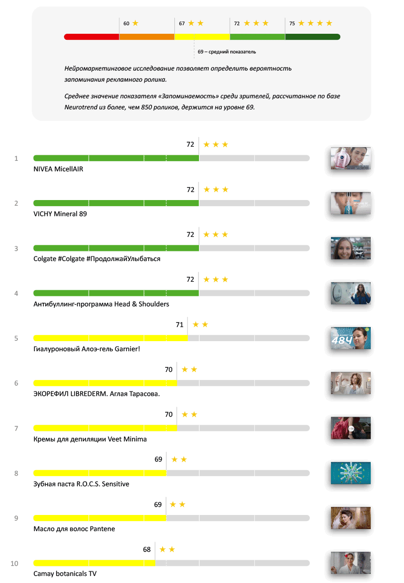 Среднее значение показателя «Запоминаемость» среди зрителей, рассчитанное по базе Neurotrend из более, чем 850 роликов, держится на уровне 69.