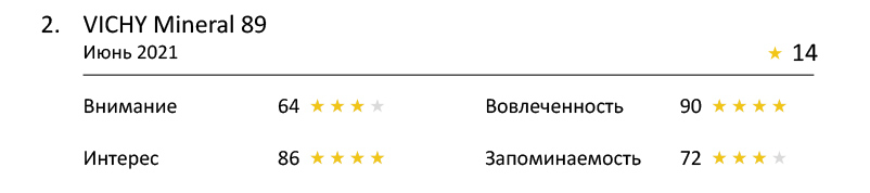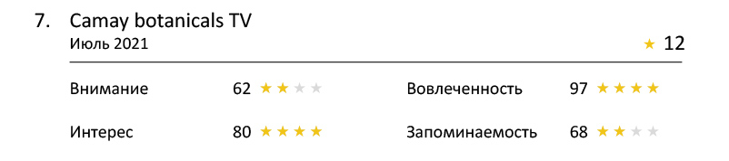 Это тематический нейромаркетинговый рейтинг рекламных видеороликов, которые транслировались на телевидении в течение года. Аналитика от компании «Нейротренд» составляется на основе психофизиологических данных, полученных в ходе исследования потребителей в момент просмотра рекламы. Ролик демонстрируется респондентам, реакция которых замеряется с помощью ЭЭГ, айтрекера и полиграфа. Каждое видео оценивается по одним и тем же параметрам — внимание, интерес, вовлеченность, запоминаемость.