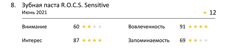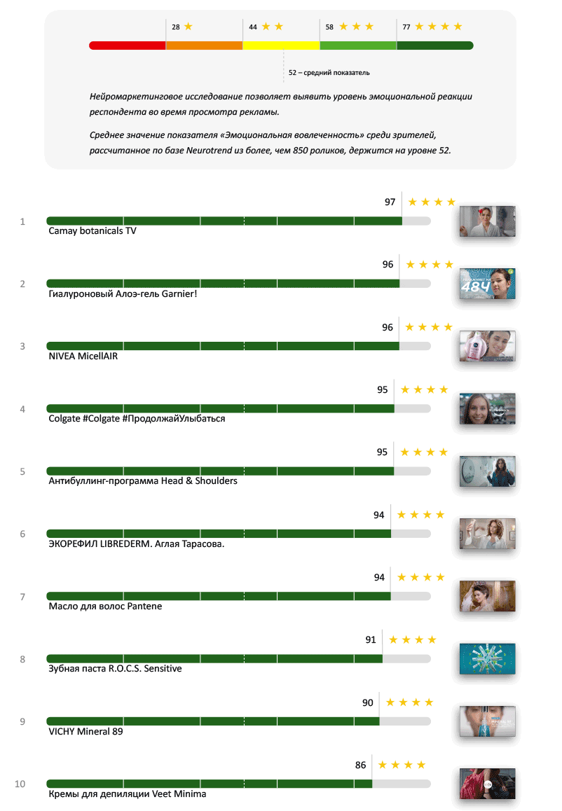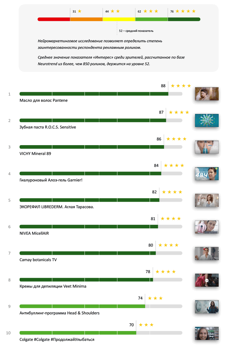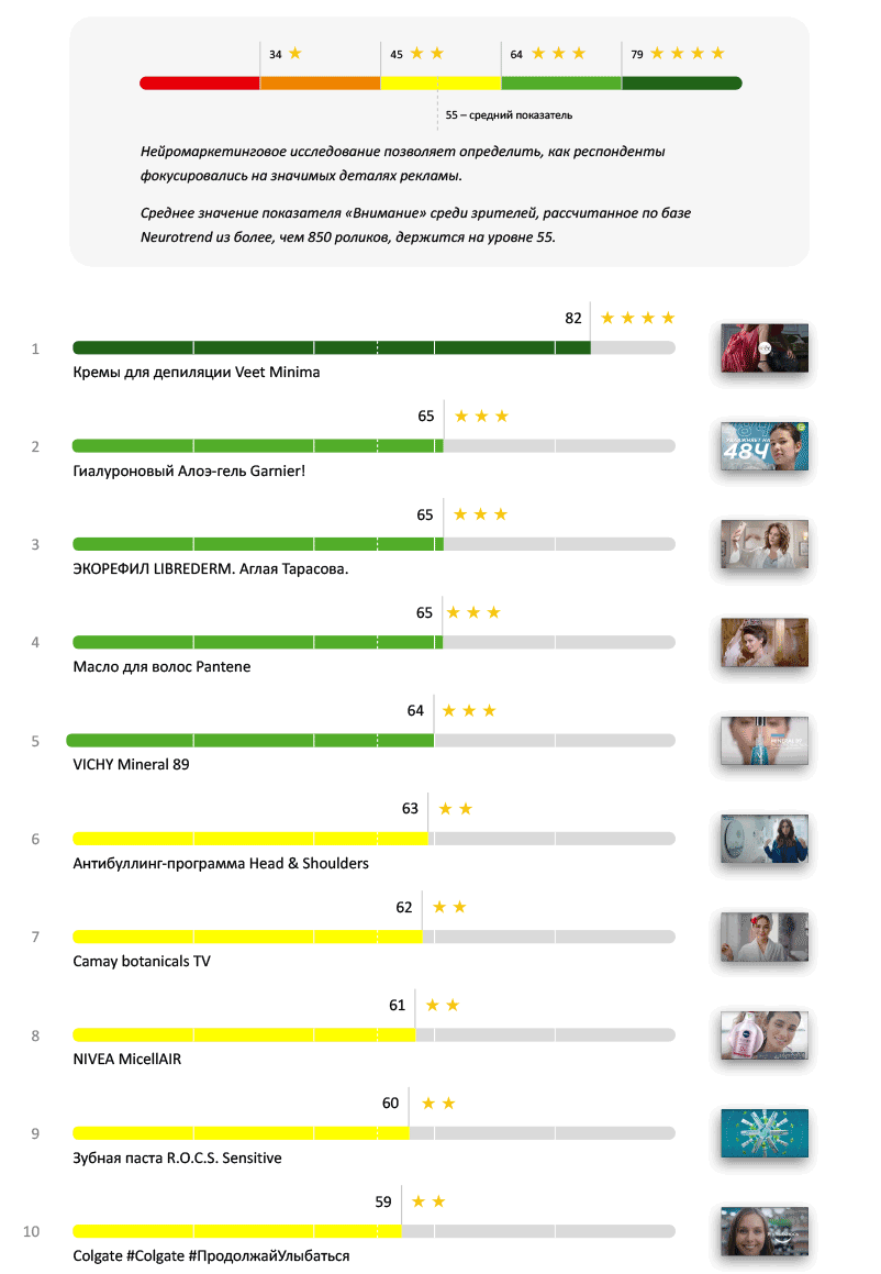 Высокий показатель и у рекламы зубной пасты, «проседающей» по интересу и вниманию. А вот спокойный Veet Minima — в конце рейтинга.