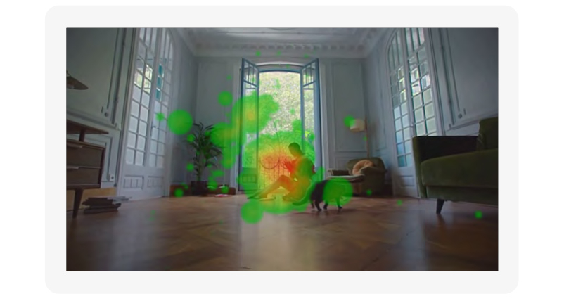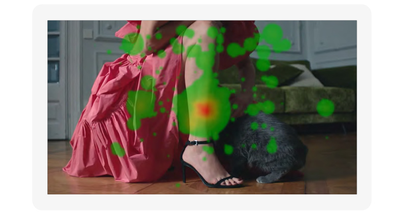Но самое главное в том, что этот план с 3 коробочками показывается очень долго для такого короткого ролика — 4 секунды. Зрители успевают рассмотреть все коробочки и взгляд возвращается к центральной, судя по тепловой карте, многие пытаются прочитать надпись на коробке.